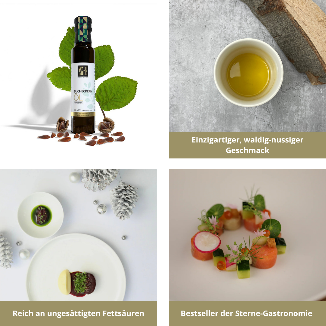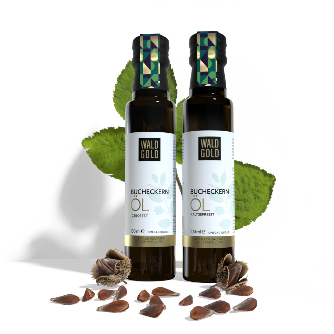 Entdecke unsere hochwertigen Öle aus nachhaltiger Wildsammlung – für eine ausgewogene Ernährung mit Geschmack und Herkunft. Egal ob unser kaltgepresstes Bucheckernöl, das geröstete Bucheckernöl oder unser einzigartiges Nuss-Cuvée aus Haselnuss-, Walnuss- und Bucheckernöl: Jedes Produkt steht für natürliche Vielfalt, ist reich an ungesättigten Fettsäuren und überzeugt durch einen einzigartigen Geschmack!